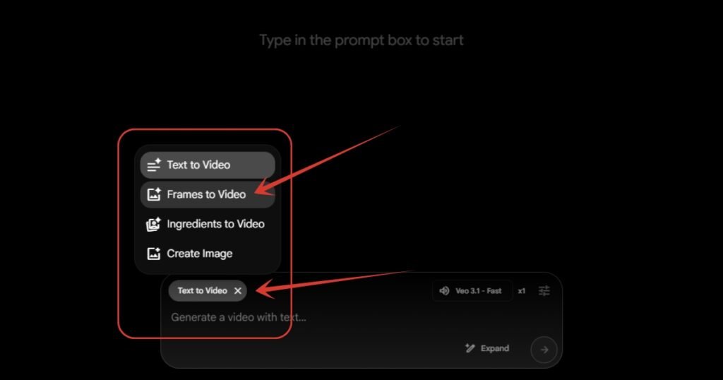 13. As you can see, after selecting the “Frame to Video” option, we have got two input slots where will be adding our image. For you kind information, Google Flow doesn’t have a straight Image to Video option, instead, in the Frame to Video option, we will be adding image to the first slot only and keep the second slop empty.