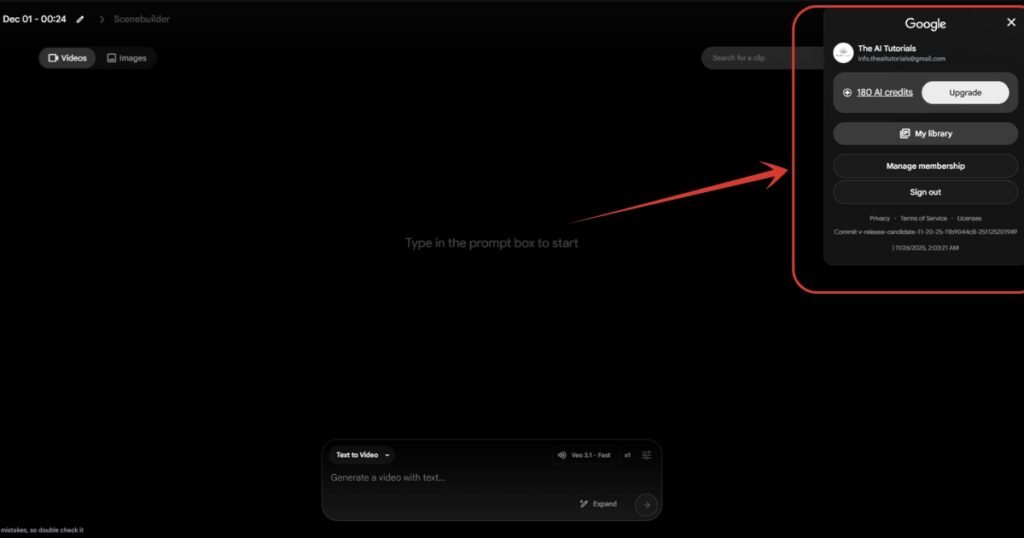 11. We are finally into the main dashboard where will add prompts, images etc. Here you can see I have 180 credits. Every new account will get 180 credits, and each video generation will cost you around 20 credits if you use the setting I will show you in further steps.