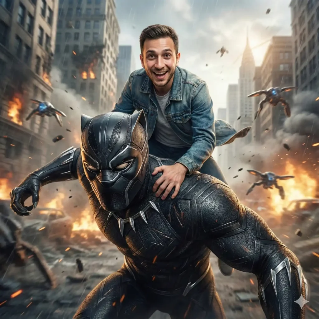 Copy Prompt: An ultra-photorealistic 8K cinematic selfie-style shot from a natural floating camera perspective—no phone visible, framed as if the person is taking a selfie. The person from the uploaded image appears with the same face, identity, and likeness, with an excited, thrilled smile. Skin shows true photorealistic texture—pores, micro-wrinkles, subtle hairs, natural reflections, and lifelike sub-surface scattering. The person is seated securely and naturally on the broad, muscular shoulder of a giant Black Panther, scaled to colossal Megazord size. Their posture is physically correct—legs positioned along the curve of Black Panther’s body, one hand gripping the vibranium suit for balance. Hair and clothing move naturally with wind and motion, shadows are accurate, and contact points are perfectly grounded. Black Panther is in dynamic motion, running at incredible speed across the battle-ravaged streets of New York. His body is fully animated in action: muscles tensed under the suit, legs extended in full sprint, cape or suit elements trailing naturally with momentum, and claws slightly extended as if ready for combat. Motion blur subtly emphasizes his furious movement, while still keeping the person on his shoulder perfectly stable. His iconic black vibranium suit is rendered in extreme detail: microscopic textures, subtle scratches and scuffs from battle, reflections of explosions, and faint energy patterns glowing on the suit. The mask fits perfectly, with reflective eye lenses showing the chaotic environment. The background depicts the final Avengers battle: collapsed buildings, shattered glass, fires, drifting smoke, Chitauri drones and soldiers flying through the air, some exploding, debris swirling naturally. Lightning and fire illuminate the scene with realistic volumetric light, casting dynamic shadows and reflections on both Black Panther and the person. Particles like dust, embers, and rain float in the air with motion blur. Lighting, shadows, and reflections are physically accurate, giving a fully immersive, cinematic, movie-like feel. The image looks like a genuine IMAX 8K photograph from the real Avengers set—extreme realism, grounded physics, lifelike skin and suit textures, natural action, perfect integration of person and giant Black Panther in dynamic motion.