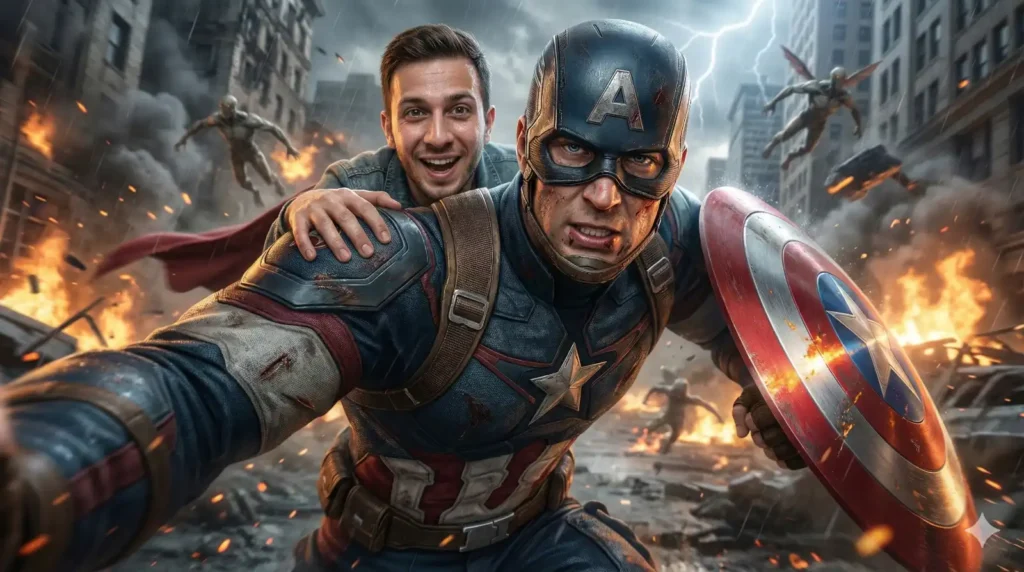 Copy Prompt: An ultra-photorealistic 8K cinematic selfie-style shot from a natural floating camera angle—no phone visible, framed as if the person is taking a selfie. The person from the uploaded image appears with the same identity and likeness, sporting an excited, thrilled smile. Their skin is rendered with extreme photorealism: natural pores, fine facial hair, subtle wrinkles, realistic sub-surface scattering, and lifelike texture. The person is securely seated on the broad, muscular shoulder of a giant Captain America, scaled to colossal, Megazord-like size. Their sitting posture is physically believable—legs gripping the armor’s curved surface, one hand holding onto the textured strap or edge of Captain America’s mask or shoulder armor for balance, natural clothing folds reacting to wind, and perfect shadows and contact points. Captain America is dynamically captured running at full speed across the battle-torn streets of New York during the final Avengers fight. His iconic masked helmet fully worn, showing the “A” emblem clearly, with intense focused eyes visible through the mask’s eye openings. His expression is fierce, determined, and battle-ready. His suit is rendered in photorealistic detail: fabric texture with woven fibers, battle damage including dirt, sweat, small tears, and abrasions, realistic leather straps and metallic buckles, and subtle reflections of explosions and fire. Captain America’s running motion is fluid and powerful, muscles tensed, with realistic motion blur on his limbs and cape trailing dynamically behind him. In his gloved hand, he tightly grips his vibranium shield, angled forward, showing scratched and worn metal surface with detailed reflections of the chaotic battlefield. The background depicts the iconic final Avengers battle in New York—collapsed buildings, shattered glass, raging fires, drifting smoke, flying Chitauri robots and chariots exploding mid-air, debris scattering naturally. Volumetric lighting from fires and lightning cuts through dense smoke and ash clouds, creating cinematic depth. Particles of dust, embers, and raindrops float realistically in the air with motion blur. All lighting, shadows, and reflections are perfectly physically accurate, producing a scene indistinguishable from a real IMAX 8K movie photo. Extreme micro-details on skin, fabric, metal, and environment. Grounded physics and perfect integration between the person and giant Captain America in motion.