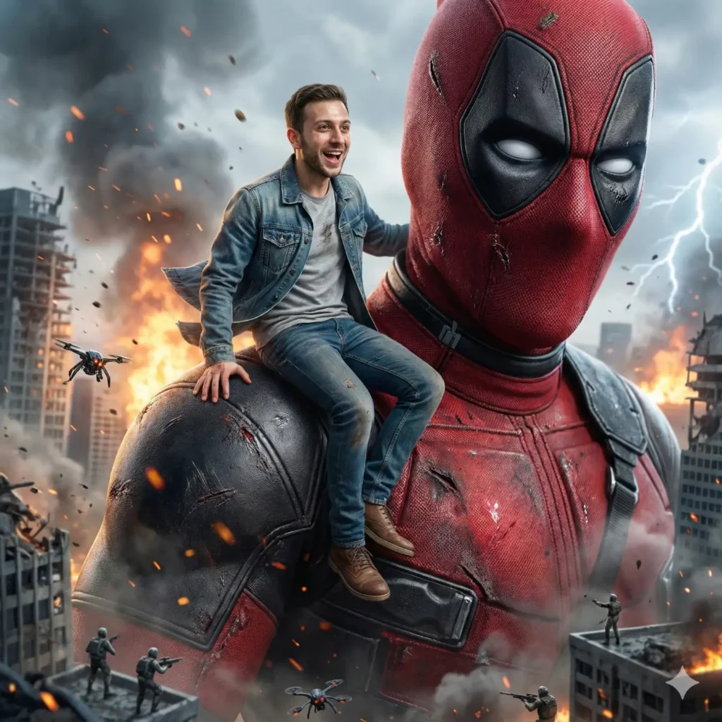 Copy Prompt: An ultra-photorealistic 8K cinematic close-up shot of a giant Deadpool’s shoulder, with the person from the uploaded image seated naturally. The perspective emphasizes the massive scale of Deadpool compared to the environment, while keeping the person fully integrated and photorealistic. The person appears with the same face, identity, and likeness, wearing a thrilled, excited smile. Skin is rendered with extreme realism: natural pores, micro-wrinkles, subtle hairs, sub-surface scattering, tiny imperfections, and natural reflections from surrounding light. Hair and clothing respond to wind, motion, and Deadpool’s movement. Shadows and contact points are physically accurate. Deadpool’s enormous shoulder is hyper-detailed: the red-and-black suit texture shows microscopic fabric weave, battle scratches, fraying, embedded dirt, sweat, and realistic tension over bulging muscles. Subtle reflections from fires, explosions, and lightning play across the suit. Muscles under the suit appear dynamic, reacting to movement and weight of the person. The background is visible but small, emphasizing Deadpool’s colossal scale. Tiny, hyper-detailed elements include broken skyscrapers, collapsed buildings, drifting smoke, and scattered debris, all scaled to make Deadpool appear immense. Volumetric light from distant fires and explosions illuminates the background subtly, giving depth and cinematic realism. Chitauri drones and soldiers are faintly visible, tiny in comparison, further dramatizing Deadpool’s giant presence. Lighting is physically accurate: reflections from background explosions, lightning, and fire subtly illuminate the person and Deadpool’s suit. Tiny dust, embers, and particles float in the air with realistic motion blur, interacting naturally with light. The shot conveys immense scale while keeping focus on the person and Deadpool’s shoulder. Every micro-detail is visible: suit seams, scratches, fabric textures, hair strands, and natural skin deformations. The image is indistinguishable from a real IMAX 8K movie photo—pure photorealism, grounded physics, and dramatic cinematic depth.