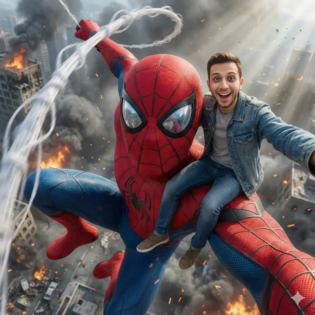 Copy Prompt: An 8K hyper-realistic, cinematic selfie-style shot captured from a floating camera perspective—no phone visible, but framed naturally as if the person is taking the selfie. The person from the uploaded reference image appears with the same identity, same facial features, and likeness, but now with a bright, excited smile and expressive eyes full of thrill and amazement. Skin textures, pores, subtle reflections, and micro-details are rendered with lifelike clarity. The person is seated securely and naturally on the massive shoulder of a giant Spider-Man, scaled up to Megazord height. Their sitting posture is physically accurate: legs positioned comfortably along the curved red-and-blue armored suit texture, one hand placed on Spider-Man’s shoulder web-pattern surface for balance, subtle contact shadows showing realistic weight distribution. Giant Spider-Man is dynamic and heroic—caught mid-action with one arm raised, either waving toward the camera or shooting a web, with the iconic white webbing extending outward in a fluid, motion-blurred arc. His suit is rendered in extreme detail: raised webbing texture, fabric seams, micro-scratches, subtle signs of battle, stretched fabric across muscles, reflective eye lenses showing environmental reflections. The scene unfolds above a chaotic battle-damaged city: shattered buildings, drifting smoke, fires burning below, sparks and debris flying through the air. Volumetric light beams through thick smoke, creating dramatic cinematic depth. Small particles—dust, ash, embers—float around them, all crisply visible in 8K clarity. The entire image is unbelievably lifelike: perfectly integrated lighting across both subjects, natural shadows, realistic reflections on Spider-Man’s lenses, and a seamless blend of scale and physics. The moment feels like an authentic behind-the-scenes shot from a massive superhero film captured with an IMAX-grade camera. Ultra-photorealistic emotion, perfect sitting logic, massive giant Spider-Man scale, dynamic web-shooting pose, extreme micro-detail, cinematic depth, and flawless 8K realism.