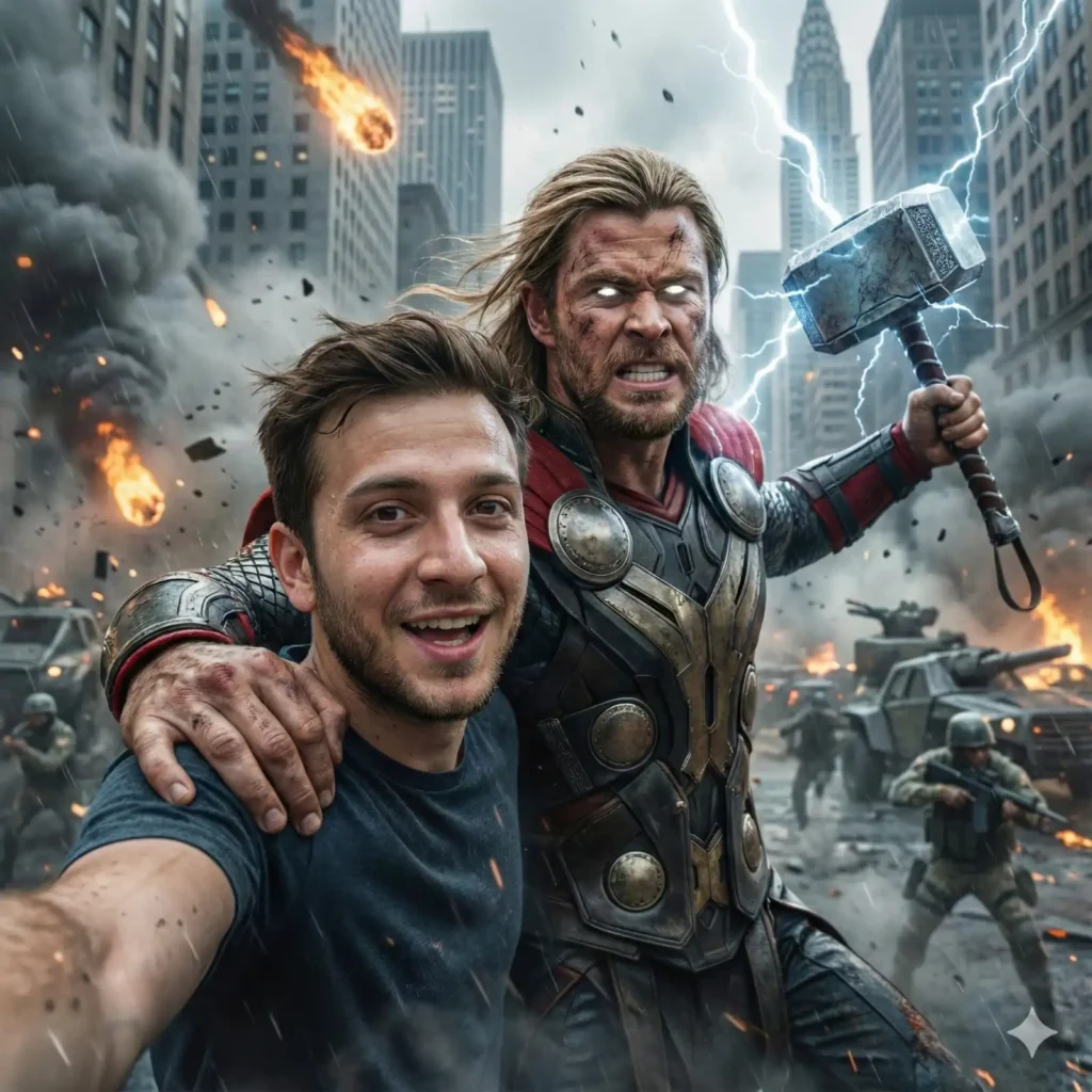 Copy Prompt: An ultra-photorealistic 8K cinematic selfie-style shot captured from a floating camera perspective—no phone visible, but framed naturally like a real selfie. The person from the uploaded image appears with the same face, identity, and likeness, but with a bright, excited smile. Their skin looks completely real: natural pores, subtle facial hair, tiny micro-wrinkles, realistic specular highlights, natural sub-surface scattering, and fully lifelike texture with zero digital styling. The person is gripping the massive shoulder of a giant Thor, scaled to colossal size, flying at furious speed through the iconic final battle of The Avengers in New York. Their sitting posture is physically accurate: body weight pressing into Thor’s armor, correct shadows, wind blowing their hair and clothing, and a natural lean toward the selfie angle. Giant Thor appears absolutely photorealistic, like a real actor on set—no CGI look. His skin shows pores, sweat, heat-reaction redness, beard stubble, individual hair strands, and realistic muscle definition. His face shows fierce rage and intensity—teeth clenched, brows furrowed, eyes glowing with electrically charged power. Thor’s hammer, Mjölnir, is held forward, pulling him through the air with unstoppable godlike force. The hammer’s metal surface is hyper-detailed with real scratches, dents, environmental reflections, and arcs of electricity dancing across it. His armor appears like real steel and leather, showing wear, battle damage, dirt, and fabric fibers in the cape. The entire scene takes place over the battle-torn streets of New York from the final Avengers fight: shattered skyscraper windows, collapsed structures, broken concrete, fireballs erupting from buildings, drifting black smoke, glowing embers, and debris flying through the air. Chitauri flying vehicles streak past in the background, some exploding mid-air. Chitauri soldiers are visible on rooftops and falling through the smoke, rendered with realistic metal, skin, and armor textures. Lightning cracks across the sky around giant Thor, illuminating the entire battlefield with brilliant white-blue flashes. Rain and dust swirl through the air with realistic motion blur and atmospheric scattering. Smoke interacts with light naturally, creating deep cinematic layers. The entire image must look like a real behind-the-scenes IMAX 8K photo from the actual Avengers movie—perfectly photorealistic lighting, real-world materials, lifelike skin texture, grounded physics, extreme micro-details, and absolutely no animated or game-like appearance.