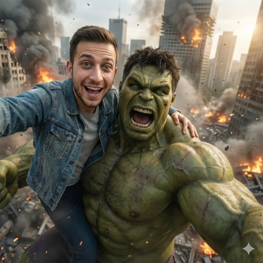 Copy Prompt: An 8K hyper-realistic, cinematic selfie-style shot captured from a floating camera perspective—no phone visible, but framed naturally as if the person is taking the selfie. The person from the uploaded reference image appears with the same identity, facial features, and likeness, now with a bright, excited smile and an expression of awe that perfectly matches the epic intensity of the moment. Skin texture, pores, reflections, and micro-details are rendered with lifelike clarity. The person is seated securely and logically on the massive, muscular shoulder of a giant Hulk, scaled to skyscraper height like a Megazord. Their posture is natural: legs positioned firmly, body slightly leaning in for the selfie angle, with one hand resting on Hulk’s thick, textured skin for balance. Contact shadows, pressure points, and physics are perfectly accurate. The giant Hulk is depicted with ferocious rage—teeth clenched, eyes glowing with fury, veins bulging, muscles rippling with unbelievable power. His skin shows extreme high-detail realism: pores, scars, micro-cracks, sweat, dirt, tiny body hairs, and subtle green variations across muscles. Dust and debris cling to his skin from the surrounding destruction. The scene takes place above a devastated city in the middle of an intense battle. Collapsed skyscrapers, burning cars, drifting embers, explosions, smoke clouds illuminated by fire, and debris flying through the air. Volumetric lighting cuts through smoke, creating dramatic, cinematic atmosphere. Every element is rendered at extreme fidelity—tiny floating dust particles, realistic reflections of flames in the person’s eyes, accurate shadows across Hulk’s massive form, and environmental lighting that blends both subjects seamlessly into the scene. The entire image feels like an authentic, IMAX-quality photograph captured in the middle of a real superhero battle. Ultra-photorealistic emotion, perfect sitting logic, massive scale, extreme texture detail, aggressive Hulk expression, cinematic depth, and flawless 8K realism.