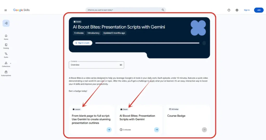 4. I click on the course AI Boost Bites: Presentation Scripts with Gemini and this page arrived where there is an introduction of the course, and the lessons to learn within.